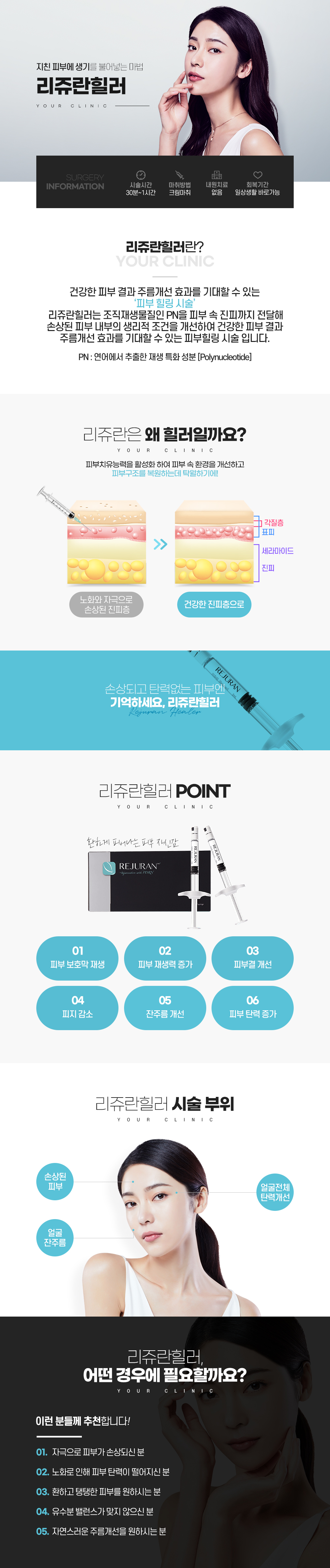 리쥬란 힐러는 생체 적합 물질인 폴리뉴클레오타이드(PN, polynucleotide)라는 성장인자 복합체로 단순히 표피층에 수분을 공급하는 마스크팩과 달리 얇고 늘어진 피부의 표피층과 진피층의 근본적인 재생을 통하여 피부를 건강하고 탄력있게 만들어 주는 시술입니다.